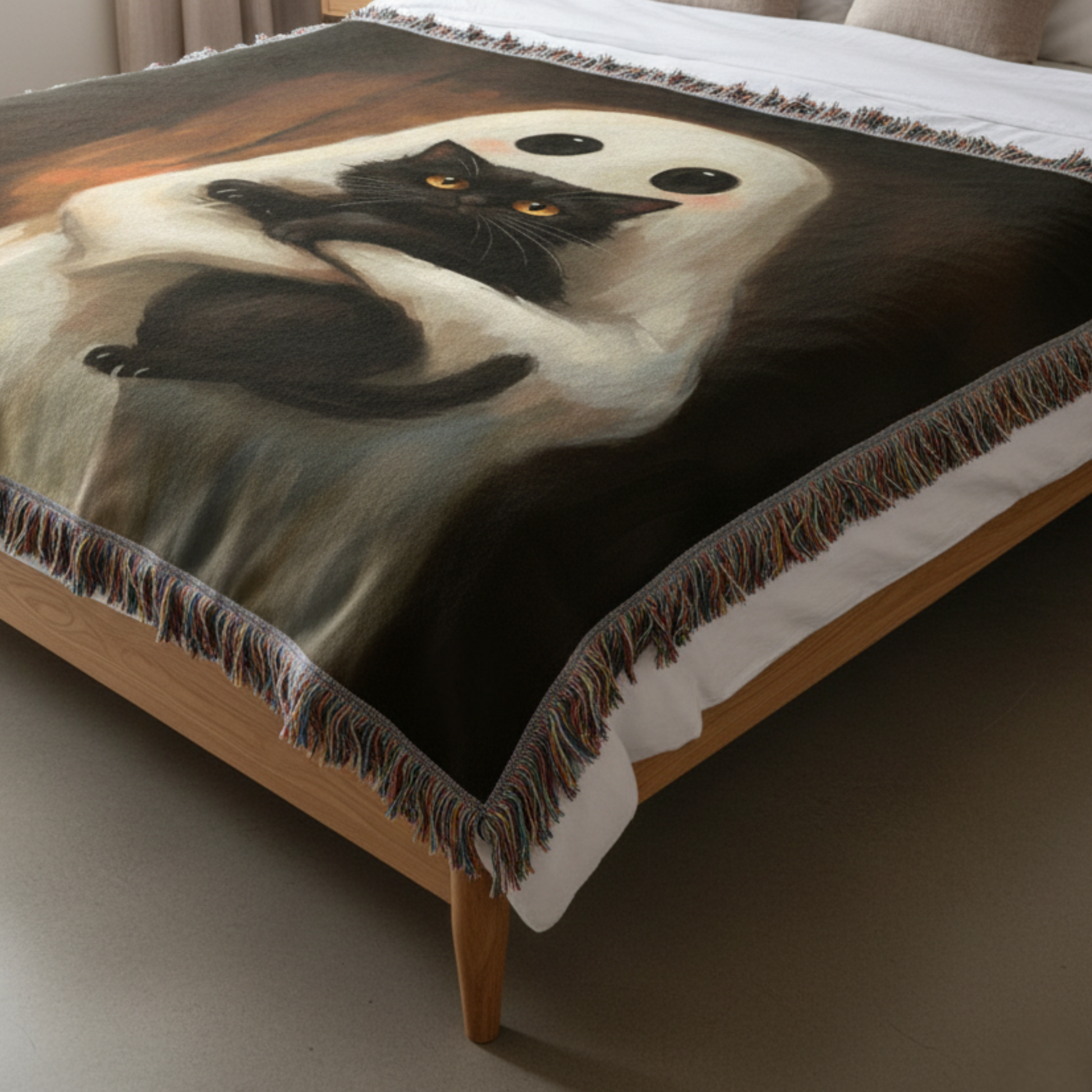 Curl up with a spooky-cute classic. This woven throw features a curious black cat and friendly ghosts, woven in rich detail with a soft, breathable cotton feel. Cozy for fall. Good all year.